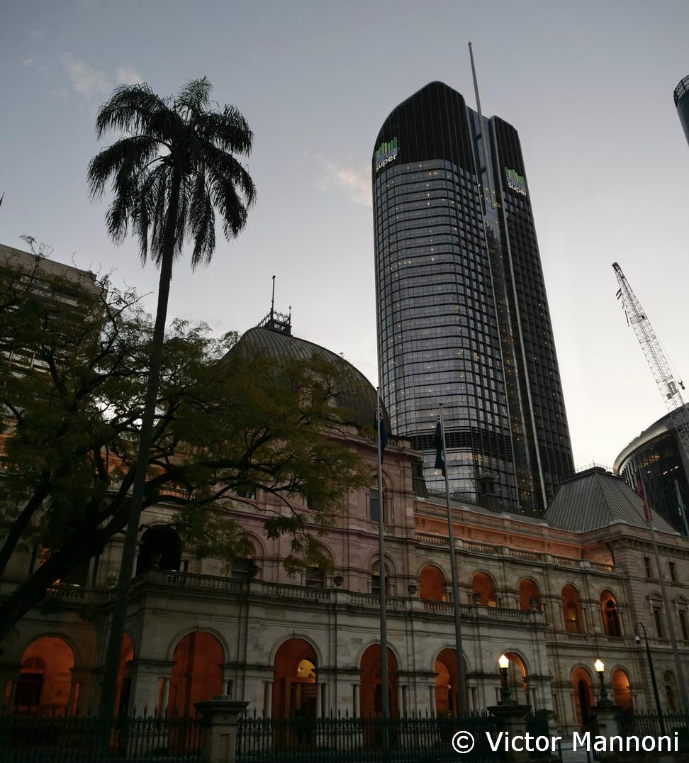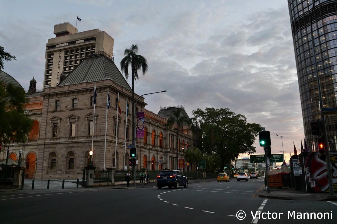 Après une première journée bien remplie, cette deuxième journée à Brisbane s’est déroulée à un rythme plus tranquille. J’ai commencé par une balade autour du Brisbane City Hall (A), dans le cœur du centre-ville. Cela m’a permis de revoir des rues que je n’avais fait qu’apercevoir la veille, et d’observer la ville sous un autre angle, plus détendu. Sans itinéraire précis, je me suis laissé porter par l’ambiance, en appréciant les volumes et les perspectives urbaines.