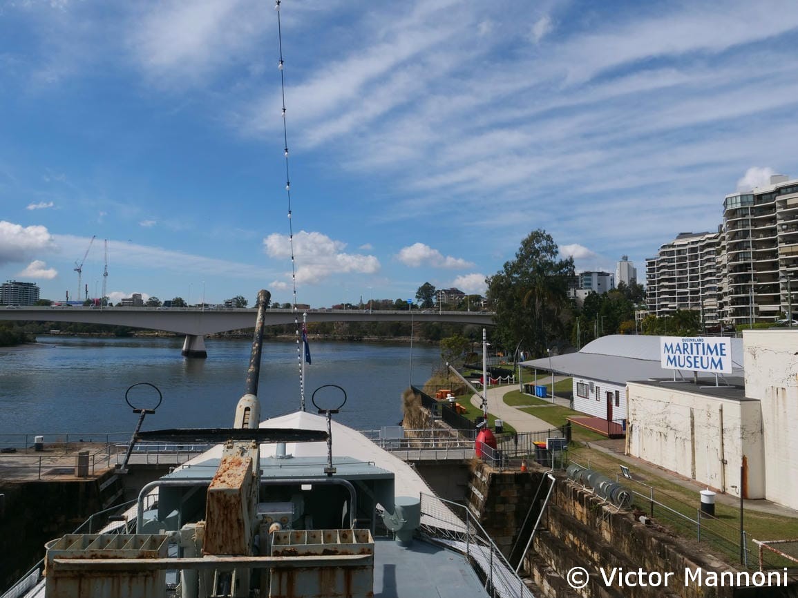 Pour cette première journée à Brisbane, j’ai choisi de commencer par explorer le centre-ville, où sont regroupés la majorité des musées et institutions culturelles (circuit Sud sur la carte). Premier arrêt : le Queensland Maritime Museum (A), situé à l’extrémité sud de South Bank. Ce musée consacré à l’histoire maritime australienne vaut largement le détour. On peut notamment y visiter un navire de guerre en cale sèche – le HMAS Diamantina – ainsi qu’une collection d’objets, de cartes et de témoignages liés à la navigation côtière. Une carte des cimetières marins du nord-est australien m’a particulièrement marqué, illustrant les dangers de cette région pour les marins des XIXe et XXe siècle.