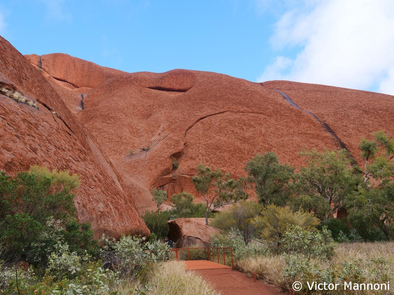 Une fois le soleil suffisamment haut, je reprends la navette pour me rapprocher d’Uluru et entamer la Base Walk, une grande boucle de près de 10 km autour du rocher. Cette marche paisible permet de découvrir toutes les facettes du site, tantôt abruptes, tantôt douces, avec parfois des cavités, des peintures rupestres, ou de simples parois lisses aux couleurs presque irréelles. Je termine la randonnée vers 13h, juste à temps pour reprendre une navette vers le resort.