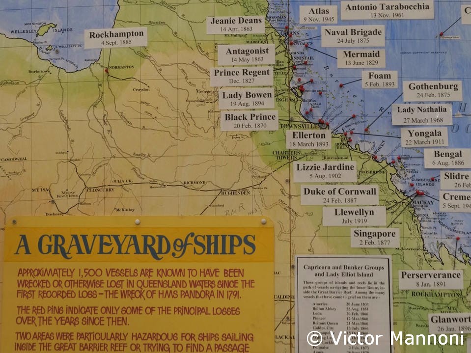 Pour cette première journée à Brisbane, j’ai choisi de commencer par explorer le centre-ville, où sont regroupés la majorité des musées et institutions culturelles (circuit Sud sur la carte). Premier arrêt : le Queensland Maritime Museum (A), situé à l’extrémité sud de South Bank. Ce musée consacré à l’histoire maritime australienne vaut largement le détour. On peut notamment y visiter un navire de guerre en cale sèche – le HMAS Diamantina – ainsi qu’une collection d’objets, de cartes et de témoignages liés à la navigation côtière. Une carte des cimetières marins du nord-est australien m’a particulièrement marqué, illustrant les dangers de cette région pour les marins des XIXe et XXe siècle.